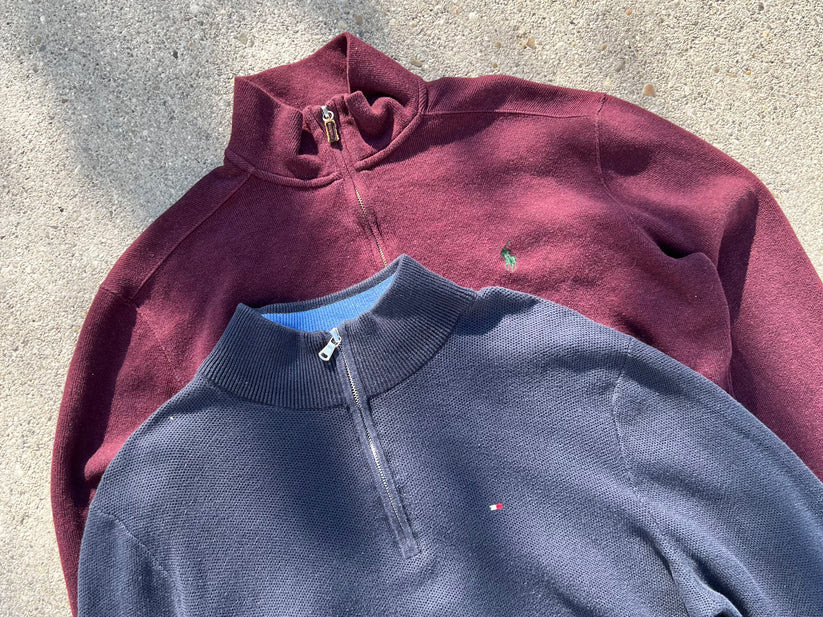 A selection of branded sweaters. The sweaters can be round neck, v-neck, quarter zip, full zip or other styles. They may be unicolor or striped. This bundle comes in different colors, styles and sizes. Brands mostly include Chaps, Tommy, Nautica, Lauren and other brands.